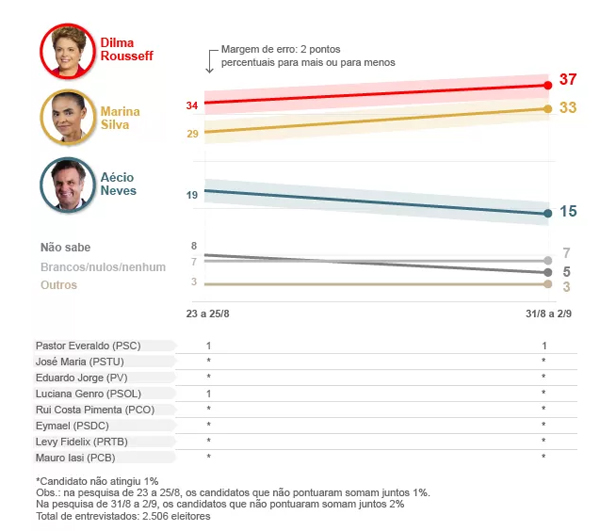(PT) com 37% das intenções de voto e Marina Silva (PSB) com 33% na